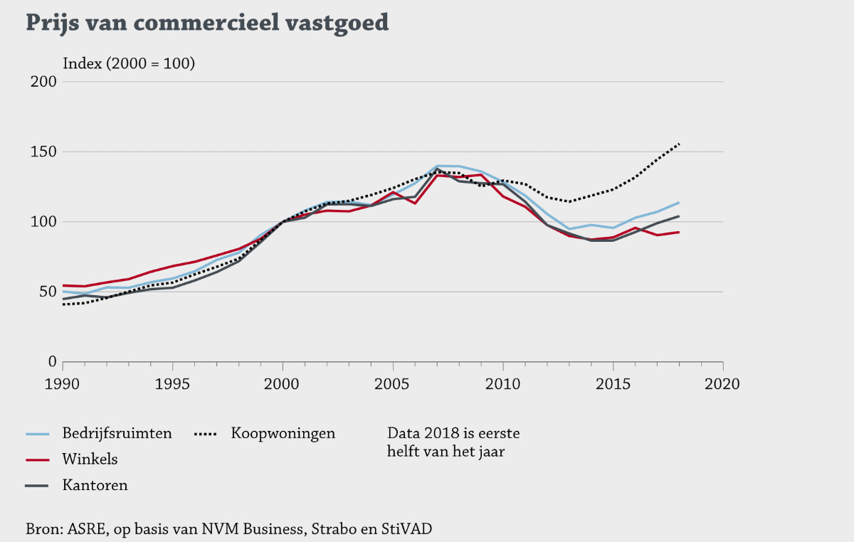 Ondanks de prijsstijging van commercieel vastgoed is de daling na 2008 nog lang niet gecompenseerd. Dat staat in contrast tot de gemiddelde prijs op de koopwoningmarkt, die zich volgens de ASRE al op een historisch hoog niveau bevindt. In de eerste helft van 2017 stegen de prijzen op die markt met bijna 9 procent opzichte van het eind van 2016.