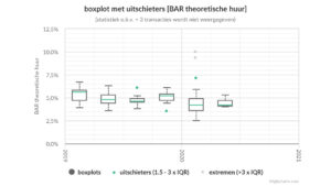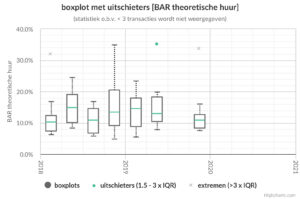 figuur boven: boxplots – met uitschieters – van het BAR – theoretische huur – per kwartaal van winkeltransacties. Het mediane BAR wordt weergegeven door de groene horizontale streep in de boxplot. Het “BAR min” is het laagste BAR.