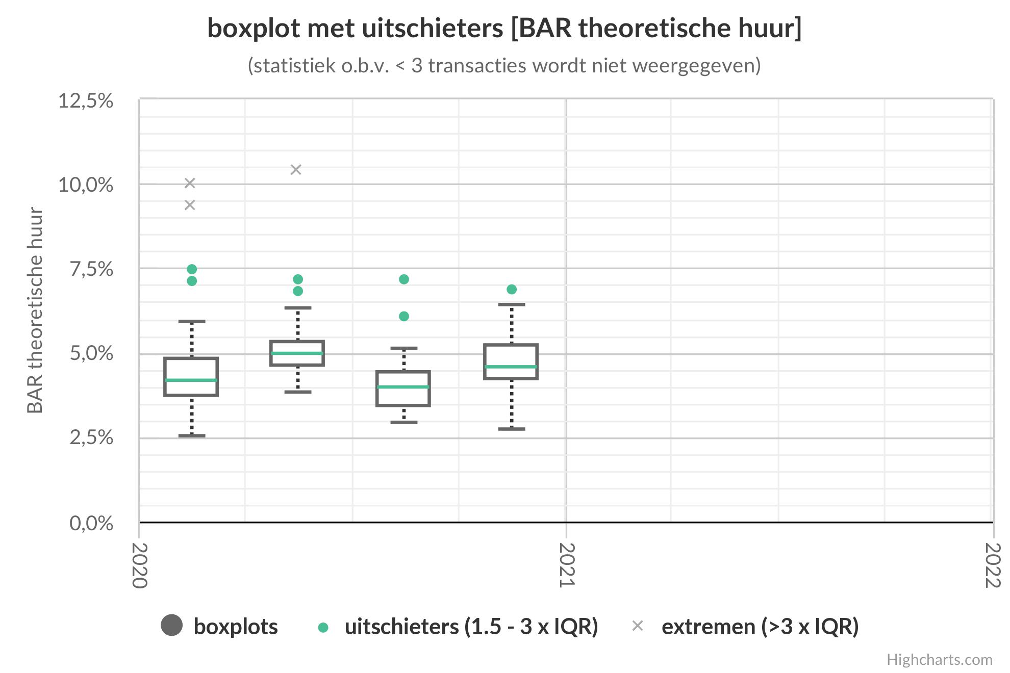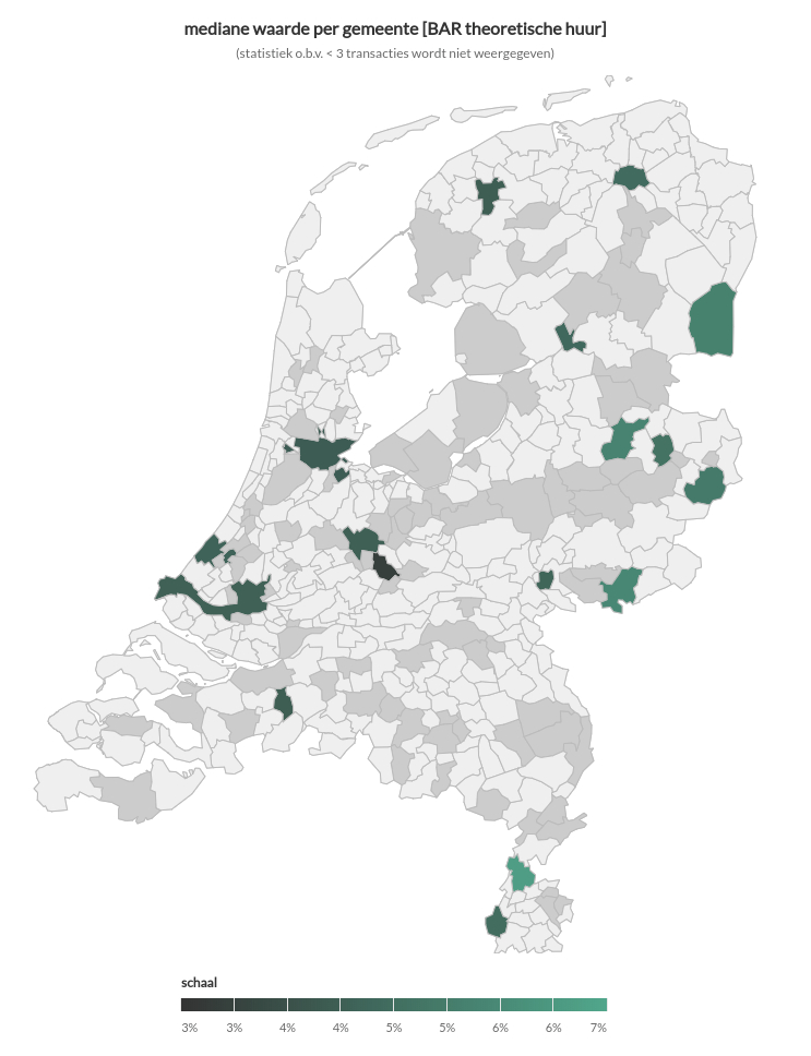 De mediane waarde voor het BAR op basis van theoretische huur was in 2020 het laagst in de gemeente Houten met 2,9 procent bij vijf transacties. In Amsterdam kwam dat uit op 3,8 procent bij elf transacties, in Utrecht op 4,1 bij acht transacties. Rotterdam spande in aantal transacties opnieuw de kroon met negentien transacties met een mediane BAR van 3,9 procent.