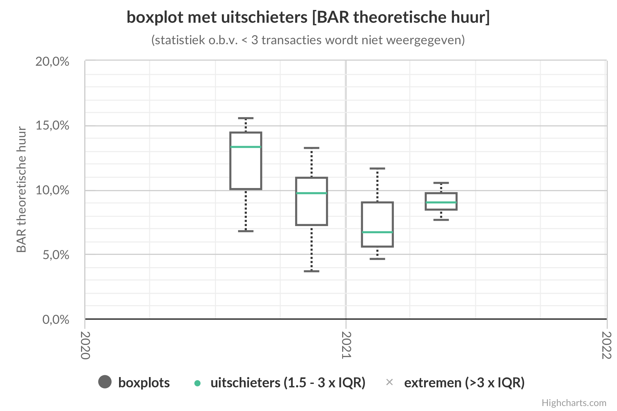 Bij de grafiek: boxplots – met uitschieters – van het BAR – theoretische huur – per kwartaal van kantorentransacties. Het mediane BAR wordt weergegeven door de groene horizontale streep in de boxplot. Het “BAR min” is het laagste BAR.