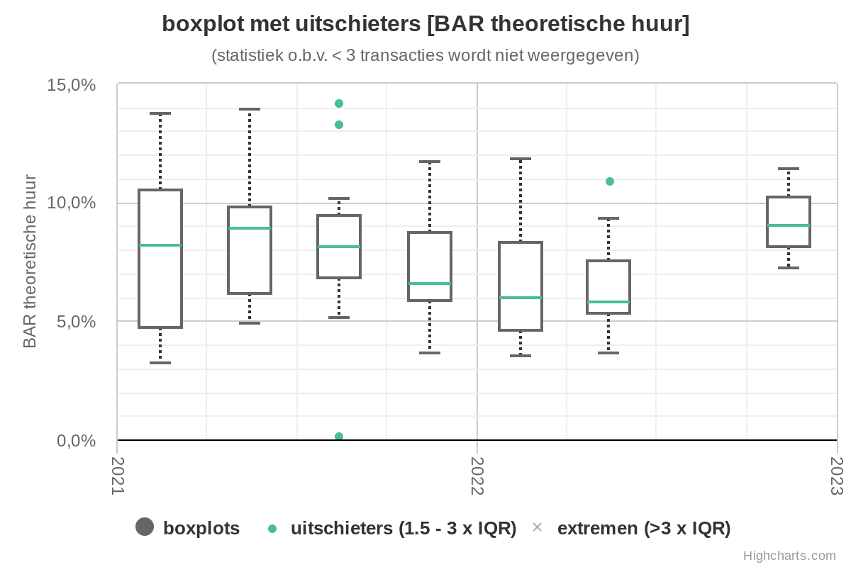 Het mediane BAR van de beleggingen in bedrijfsruimten en logistieke panden waarbij deelnemers in StiVAD betrokken waren daalde in de eerste twee kwartalen nog van 6,0 naar 5,9 procent. Voor het derde kwartaal kon geen boxplot worden getekend doordat er te weinig transacties van StiVAD-deelnemers werden geregistreerd. De getoonde stijging naar 9,1 procent voor het vierde kwartaal staat nog niet vast: nog niet alle transacties in het vierde kwartaal zijn in dit cijfer verwerkt.