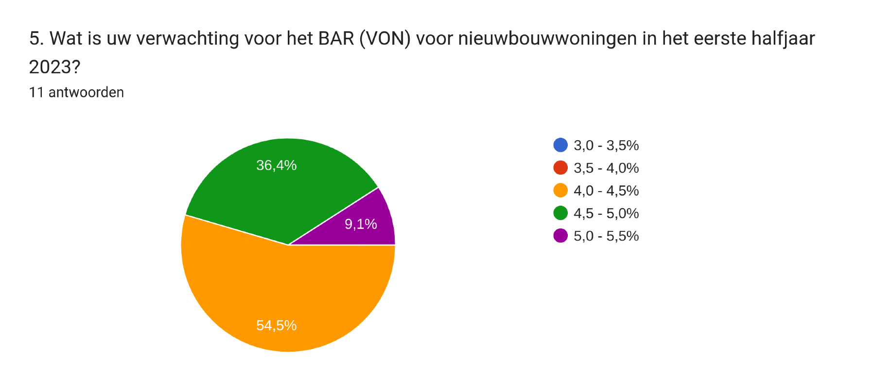 Van de deelnemende woningbeleggers voorziet 55 procent het BAR voor nieuwbouwwoningen in 2023 oplopen naar een niveau tussen 4,0 en 4,5 procent. Ruim een derde van de respondenten ziet het BAR zelfs stijgen naar een niveau tussen 4,5 en 5,0 procent. Eén belegger denkt zelfs dat het BAR boven 5 procent komt te liggen. In 2022 bereikte het mediane BAR voor nieuwbouw in het tweede kwartaal zijn laagste stand met een waarde van 3,6 procent en is inmiddels opgelopen naar 4,2 procent tegen het jaareinde, zo blijkt uit een analyse van het vastgoedbeleggingstransactieregister (VBTR) van StiVAD.