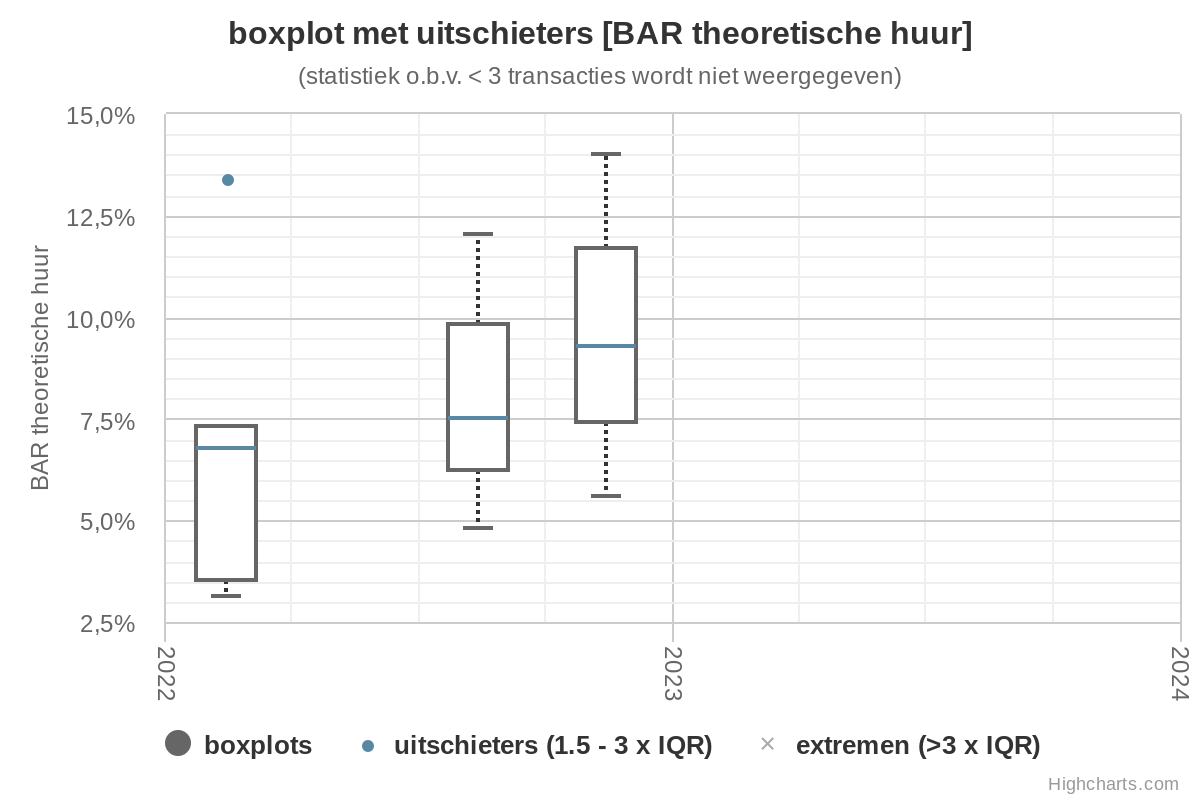 Bij de grafiek: boxplots – met uitschieters – van het BAR – theoretische huur – per kwartaal van kantorentransacties. Het mediane BAR wordt weergegeven door de groene horizontale streep in de boxplot. Het “BAR min” is het laagste BAR.