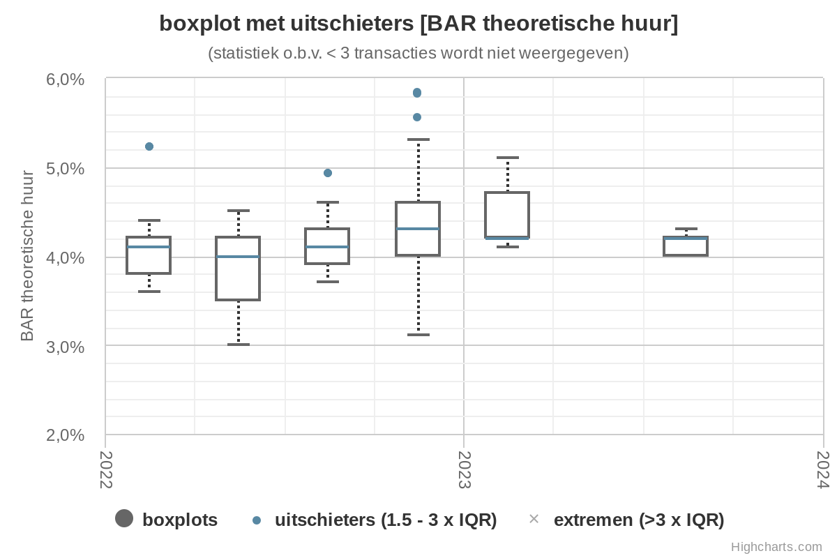 Bij de grafiek: boxplots – met uitschieters – van het BAR (theoretische huur) per kwartaal van transacties met woningcomplex. Het mediane BAR wordt weergegeven door de groene horizontale streep in de boxplot. Het “BAR min” is het laagste BAR.