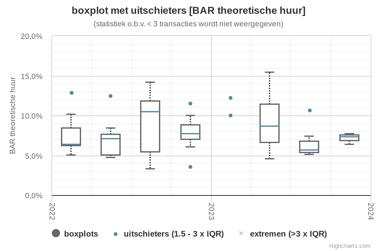 Bij de grafiek: boxplots – met uitschieters – van het BAR – theoretische huur – per kwartaal van winkeltransacties. Het mediane BAR wordt weergegeven door de groene horizontale streep in de boxplot. Het “BAR min” is het laagste BAR.
