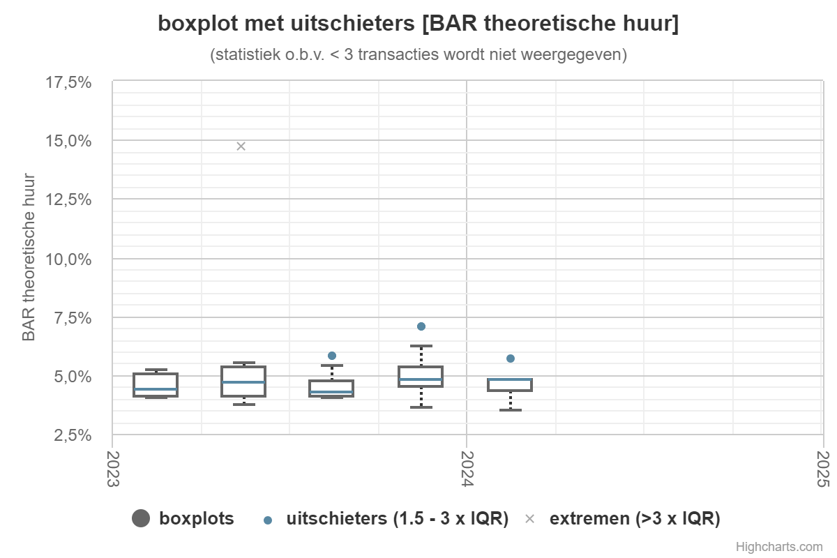 Bij de grafiek: boxplots – met uitschieters – van het BAR (theoretische huur) per kwartaal van transacties met woningcomplex. Het mediane BAR wordt weergegeven door de groene horizontale streep in de boxplot. Het “BAR min” is het laagste BAR.