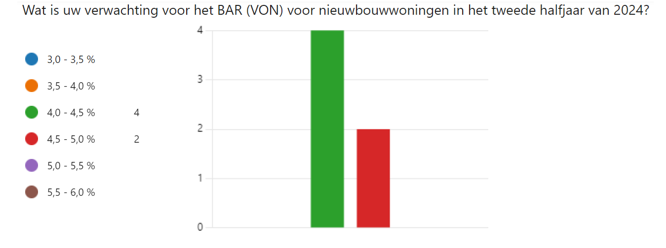 In het voorjaar van 2024 zei 70 procent van de ondervraagde beleggers voor de eerste jaarhelft een BAR te verwachten tussen 4,5 en 5 procent. Tien procent verwachtte zelfs een BAR die nog een half procent hoger lag. Twintig procent van de beleggers verwachtte juist een lagere BAR tussen 4,0 en 4,5 procent, zoals de meerderheid op dit moment aangeeft.