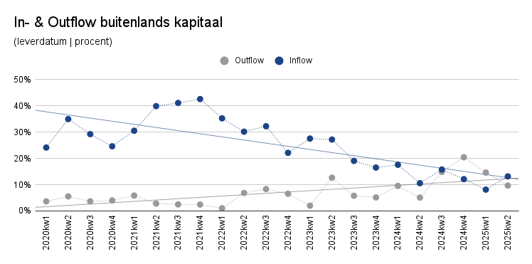 De kantorenmarkt, ooit een trekpleister voor buitenlands kapitaal, verloor snel terrein. In 2020 namen buitenlandse partijen nog twee derde van de investeringen voor hun rekening. Vier jaar later resteerde slechts 15%. Vanaf medio 2022 is de uitstroom hier structureel groter dan de instroom. De combinatie van hybride werken, onzekerheid over waarderingen en de hoge overdrachtsbelasting maakt dat buitenlandse beleggers deze sector mijden.