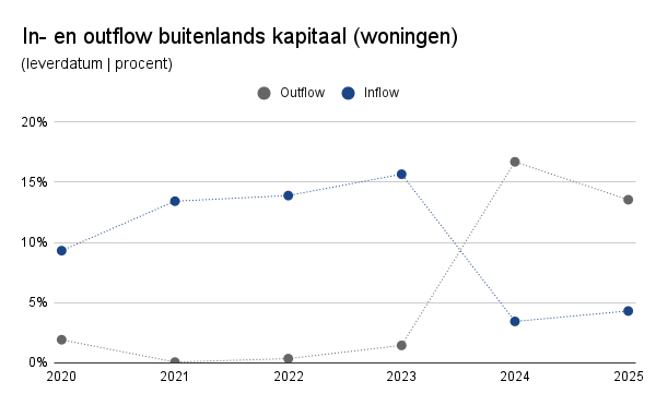 De omslag valt samen met de invoering van de Wet betaalbare huur, die grote aantallen huurwoningen in de vrije sector naar de gereguleerde middenhuursector duwde. Woningbeleggers zien hierdoor hun potentiële huuropbrengsten fors dalen. Het gevolg: sinds half 2024 vloeit er meer buitenlands beleggingskapitaal uit Nederlands vastgoed dan er instroomt.