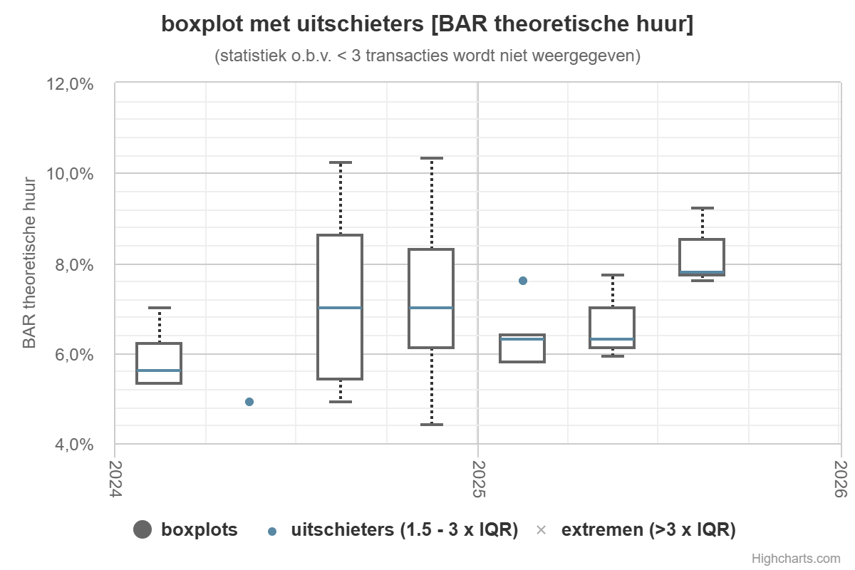 Bij de grafiek: boxplots – met uitschieters – van het BAR (theoretische huur) per kwartaal van transacties met woningcomplex. Het mediane BAR wordt weergegeven door de groene horizontale streep in de boxplot. Het “BAR min” is het laagste BAR.