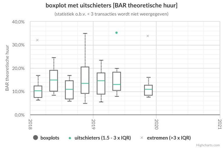 figuur boven: boxplots – met uitschieters – van het BAR – theoretische huur – per kwartaal van kantorentransacties. Het mediane BAR wordt…